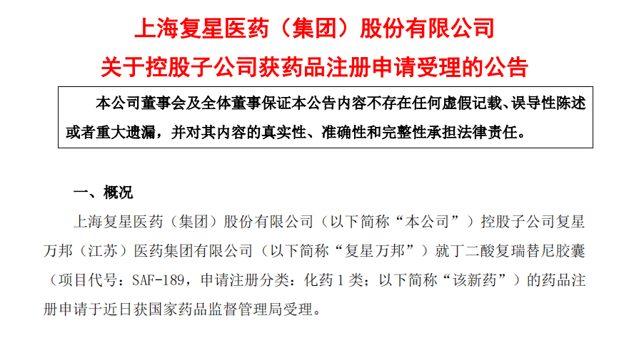 3月6日,复星医药(600196)发布公告称,其控股子公司复星万邦(江苏)医药集团有限公司研发的1类新药丁二酸复瑞替尼胶囊(项目代号:SAF-189)的药品注册申请获国家药品监督管理局(NMPA)受理,拟用于治疗间变性淋巴瘤激酶(ALK)阳性的局部晚期或转移性非小细胞肺癌(NSCLC)患者。