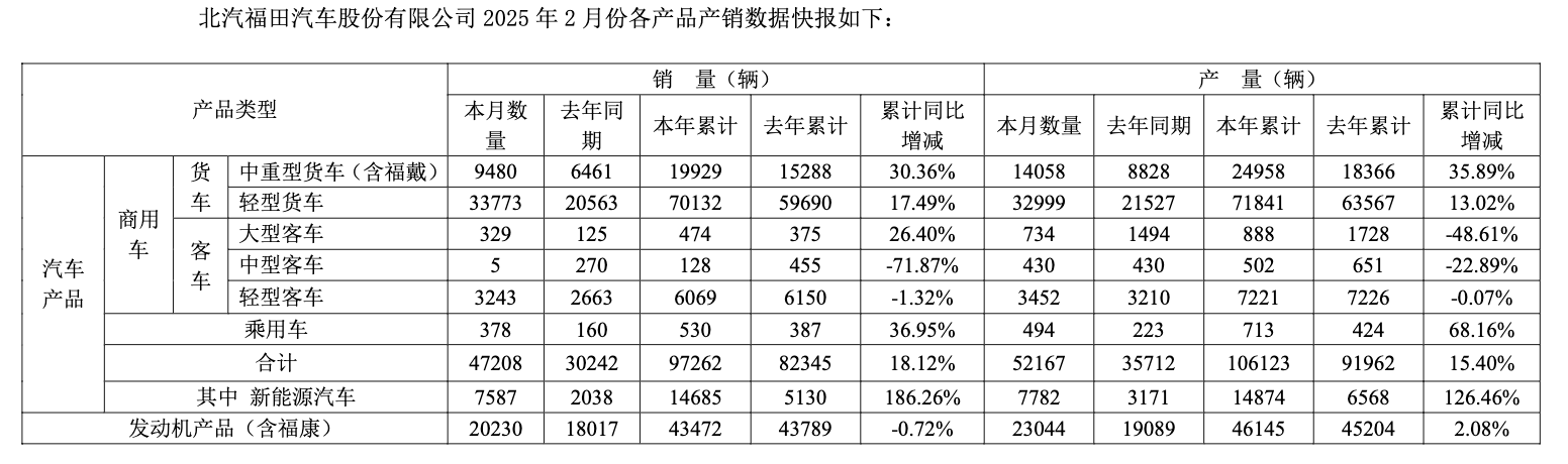2月份,福田汽车全系销量4.7万辆,同比增加56.1%,其核心商用车货车业务销量都在大增。2025年前两个月福田汽车累计销量9.7万辆,同比增幅18.1%,其中公司中重型货车和轻型货车分别销售2万辆、7万辆,同比增长30.4%、17.5%。
