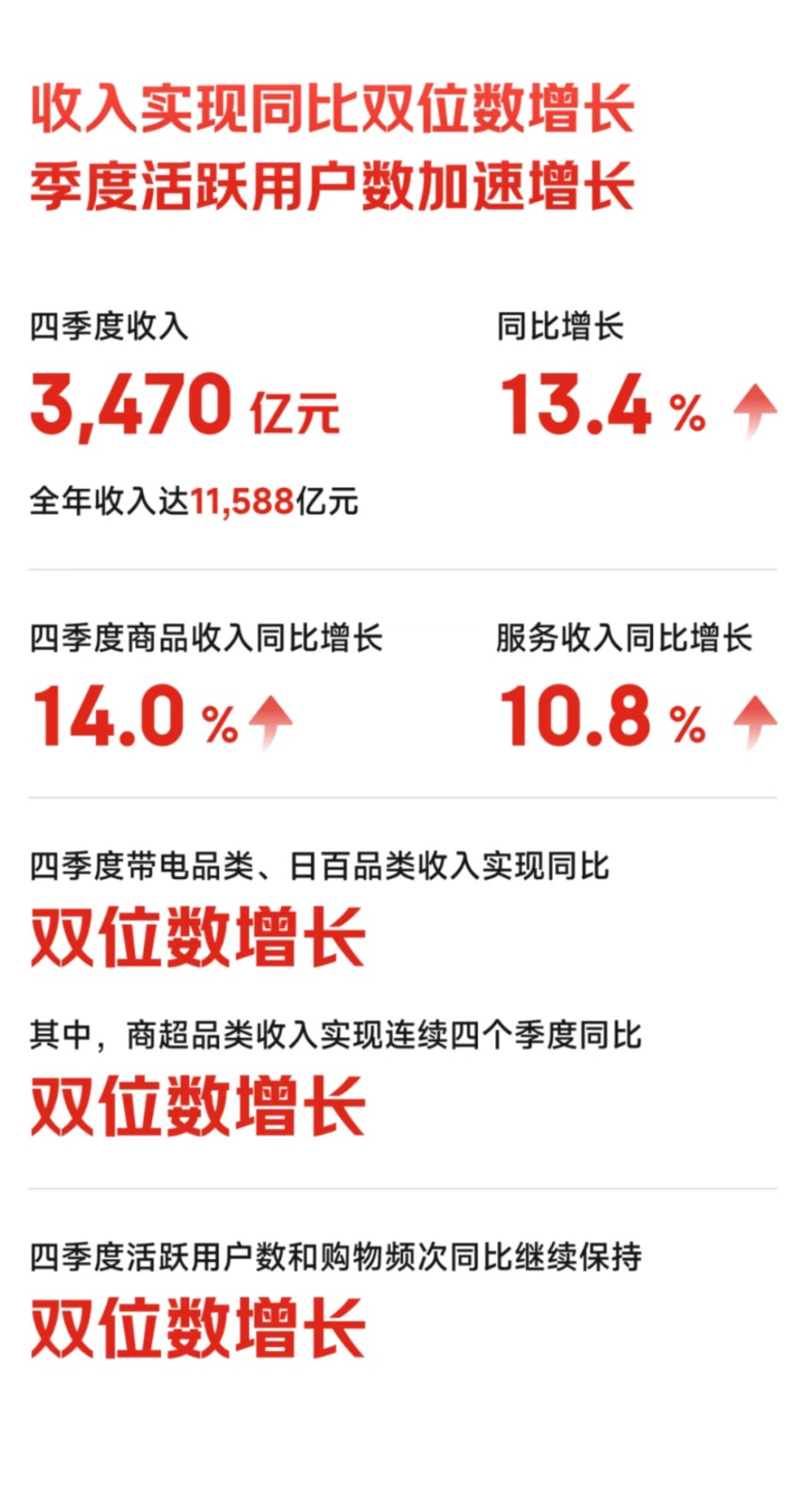 “在消费市场逐步回暖的背景下,我们以四季度的强劲表现为2024年圆满收官。京东收入同比增速重回双位数,利润也保持了健康增长。此外,本季度大部分品类收入以及包括活跃用户数和购物频次在内的关键指标均实现了健康的双位数同比增长。”京东集团首席执行官许冉女士表示。