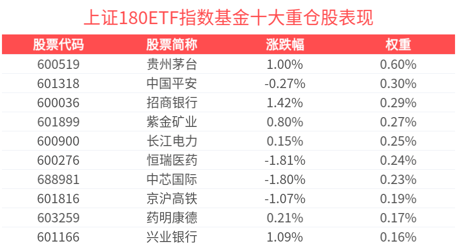 数据显示,截至2025年2月28日,上证180指数(000010)前十大权重股分别为贵州茅台(600519)、中国平安(601318)、招商银行(600036)、恒瑞医药(600276)、紫金矿业(601899)、长江电力(600900)、中芯国际(688981)、药明康德(603259)、京沪高铁(601816)、寒武纪(688256),前十大权重股合计占比24.19%。