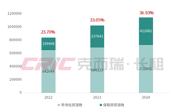 克而瑞监测数据显示,2024年核心八城集中式公寓规模超114万间,保租房规模42.2万间,市场占有率达到37%,三年内市占率增长超13%。
