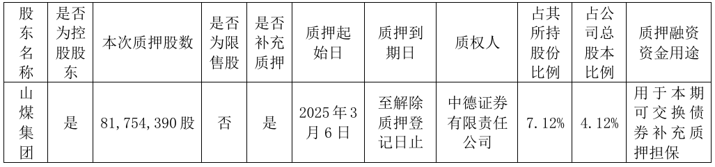 3月7日,山煤国际(600546)发布公告,公司于2025年3月7日收到控股股东山煤集团的通知,山煤集团已将其持有的公司8175万股无限售流通股股票质押给本次可交换债券的受托管理人中德证券有限责任公司,并将该部分股票划转至山煤集团在中国证券登记结算有限责任公司上海分公司开立的“山西煤炭进出口集团有限公司-2022年面向专业投资者非公开发行可交换公司债券(第一期)质押专户”,用于保障本次可交换债券持有人交换标的股票或本次可交换债券本息按照约定如期足额兑付。