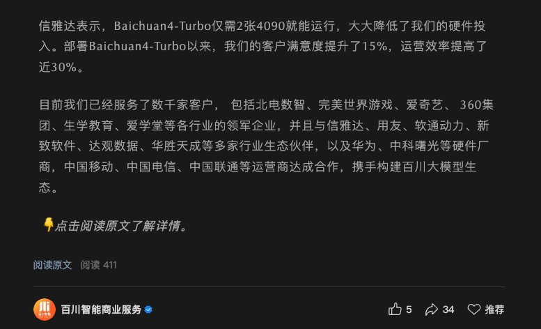 从百川智能商业服务公众号可以看到,商用业务部门2024年给百川带来了新华三、北电数智、信雅达、实达集团、天开集团、完美世界游戏等多个头部企业客户和合作伙伴,涉及金融、国央企等众多大型企业。
