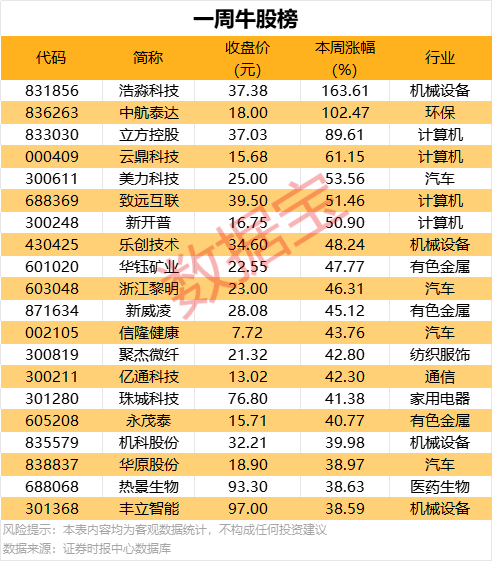 从本周来看,A股主要指数均录得一定幅度的上涨,上证指数上涨1.56%,北证50上涨6.45%,科创50上涨2.67%。个股方面,本周近4000股实现上涨,涨幅20%以上的有140只,其中,7只股涨超50%,北交所的浩淼科技在本周前4日已实现股价翻倍,周五继续大涨,本周累计涨幅达163.61%,中航泰达本周也实现股价翻倍。