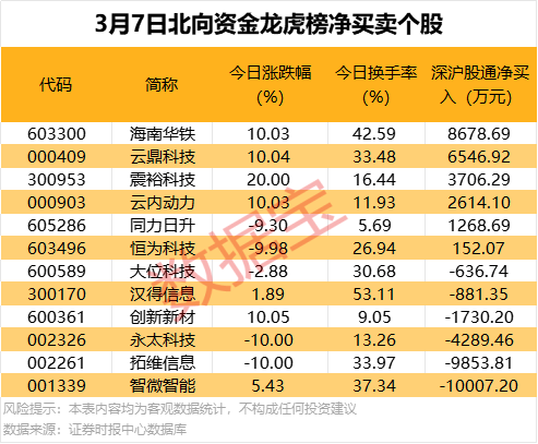 3月7日龙虎榜中,共14股获机构净买入,酷特智能、三维通信均获机构净买入超8000万元。机构净卖出金额居前的有汉得信息、震裕科技等,金额均超1亿元。