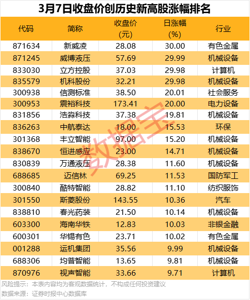 收盘价创历史新高股中,今日股价平均上涨8.91%,涨停的有新威凌、威博液压、立方控股等,涨幅居前的有浩淼科技、中航泰达、丰立智能等。