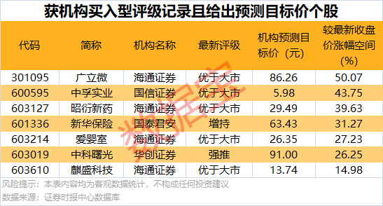 以公布的预测目标价与最新收盘价进行对比,共有6股上涨空间超20%,广立微上涨空间最高,3月7日海通证券预测公司目标价为86.26元,上涨空间达50.07%。上涨空间较高的个股还有中孚实业、昭衍新药,分别为43.75%、39.63%。