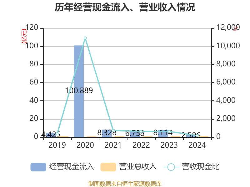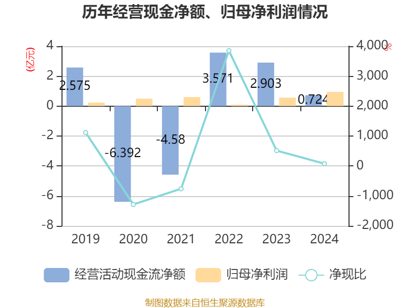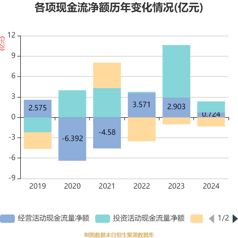 截至2024年,公司经营活动现金流净额为7243.13万元,同比下降75.05%;筹资活动现金流净额-1.35亿元,同比减少3092.01万元;投资活动现金流净额1.62亿元,上年同期为7.72亿元。
