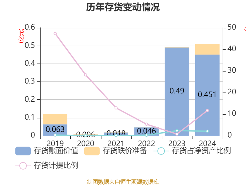 从存货变动来看,截至2024年末,公司存货账面价值为4512.55万元,占净资产的2.08%,较上年末减少389.08万元。其中,存货跌价准备为595.52万元,计提比例为11.66%。