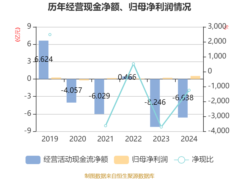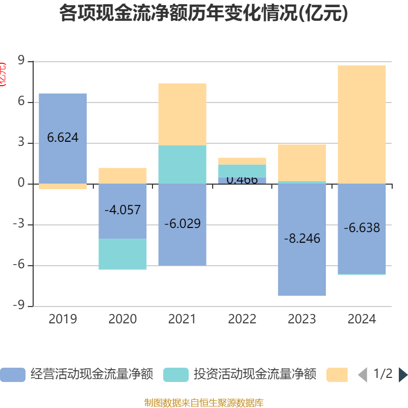 截至2024年,公司经营活动现金流净额为-6.64亿元,同比增加1.61亿元;筹资活动现金流净额8.69亿元,同比增加6亿元;投资活动现金流净额-679.7万元,上年同期为1802.53万元。