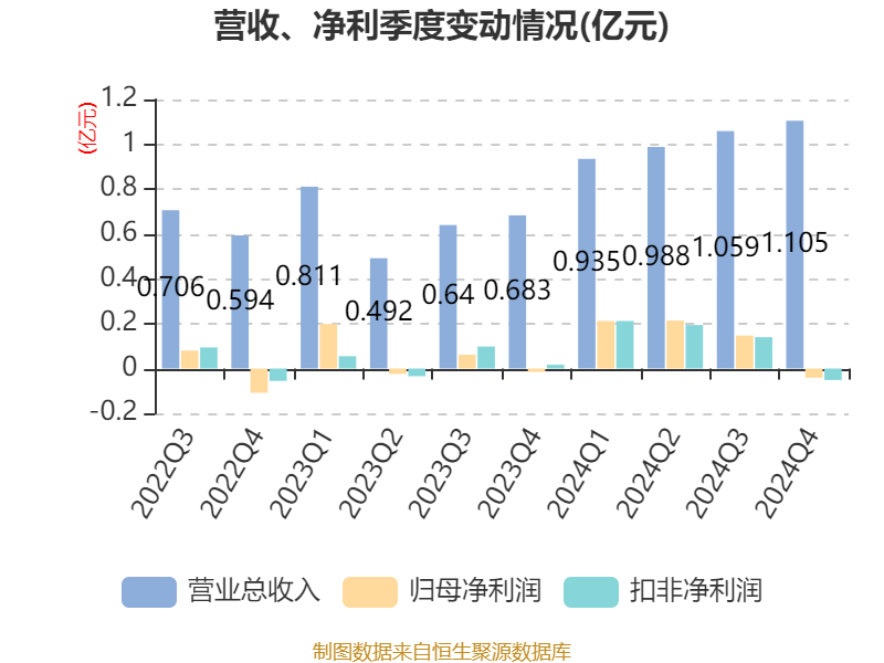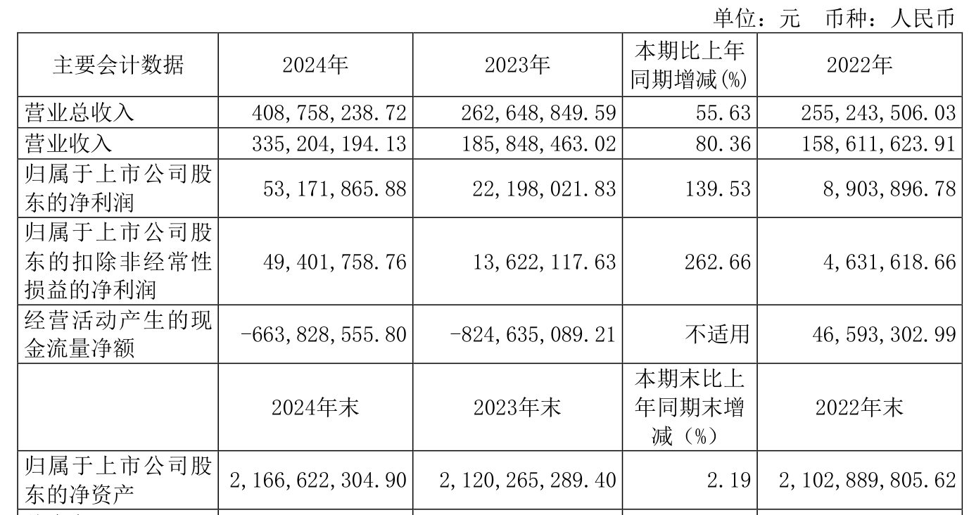 中证智能财讯香溢融通(600830)3月8日披露2024年年度报告。2024年,公司实现营业总收入4.09亿元,同比增长55.63%;归母净利润5317.19万元,同比增长139.53%;扣非净利润4940.18万元,同比增长262.66%;经营活动产生的现金流量净额为-6.64亿元,上年同期为-8.25亿元;报告期内,香溢融通基本每股收益为0.117元,加权平均净资产收益率为2.48%。公司2024年度分配预案为:拟向全体股东每10股派现0.15元(含税)。