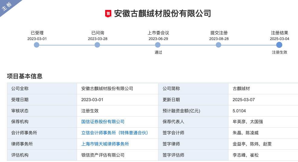值得一提的是,古麒绒材于2023年8月28日提交注册,从提交注册至获得注册批文用时一年半。