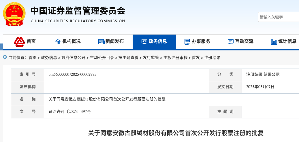 3月7日,证监会网站注册结果显示,同意安徽古麒绒材股份有限公司(以下简称“古麒绒材”)首次公开发行股票的注册申请。古麒绒材本次深市主板IPO保荐机构为国信证券股份有限公司。