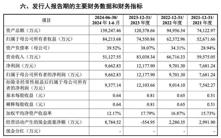 2021年度至2024年1-6月(报告期),公司营业收入分别为5.96亿元、6.67亿元、8.30亿元和5.11亿元,2021-2023 年复合增长率为18.06%;归属母公司股东的净利润分别为7681.24万元、9701.30万元、1.22亿元和9662.83万元,2021-2023 年复合增长率为 25.91%。