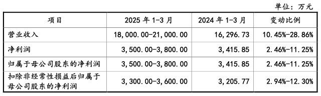 2025年1-3月,公司预计营业收入1.8亿元~2.1亿元,同比增长10.45%-28.86%;归母净利润为3500万元-3800万元,同比增长2.46%-11.25%。