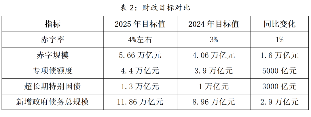 政府工作报告中,首次提出“更加积极的财政政策+适度宽松的货币政策”组合,释放逆周期调节信号。财政赤字率提升至4%,为历史新高,对应赤字规模5.66万亿元;广义财政赤字率(含专项债、特别国债)达8.4%,显著高于疫情时期水平。拟发行超长期特别国债1.3万亿元,比上年增加3000亿元;拟发行特别国债5000亿元;拟安排地方政府专项债券4.4万亿元,比上年增加5000亿元等。2025年合计新增政府债务总规模11.86万亿元,比上年增加2.9万亿元,财政支出强度明显加大。推动更多资金资源“投资于人”、服务于民生,支持扩大就业、促进居民增收减负、加强消费激励,形成经济发展和民生改善的良性循环。
