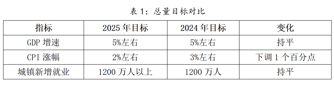 2025年政府工作报告整体延续了中央经济工作会议的“稳中求进、以进促稳”的基调,在综合考虑国内外形势和各方面因素的基础上,设定5%左右的GDP增长目标,包括扩大内需、产业升级、防范风险、深化改革、保障民生等几大核心任务。5%左右的增长目标与2024年目标持平,既体现短期稳就业、防风险的底线要求,也与“十四五”规划及2035年经济总量翻番的中长期目标相衔接。不过,从绝对数值来看,2023年、2024年中国实际GDP总量为122.15万亿元和128.23万亿元,2025年目标则接近135万亿元,环比增长规模进一步扩大。“更趋复杂严峻”的外部环境下,这一增长目标突出了迎难而上、奋发有为的鲜明导向。