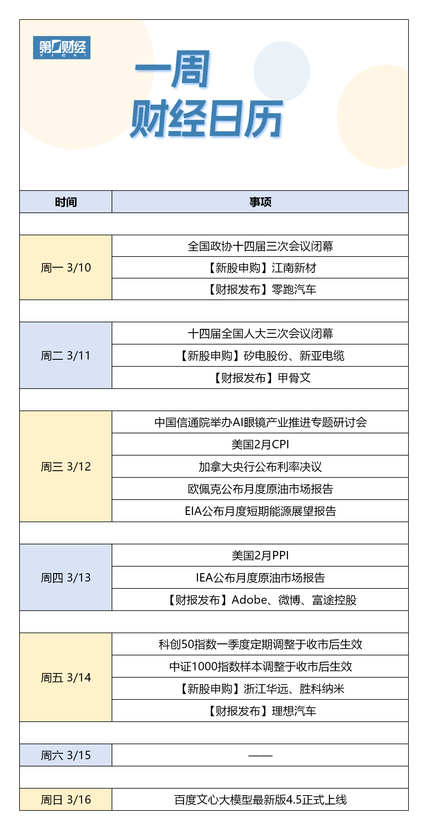 【下周财经日历】3月10日-3月16日。