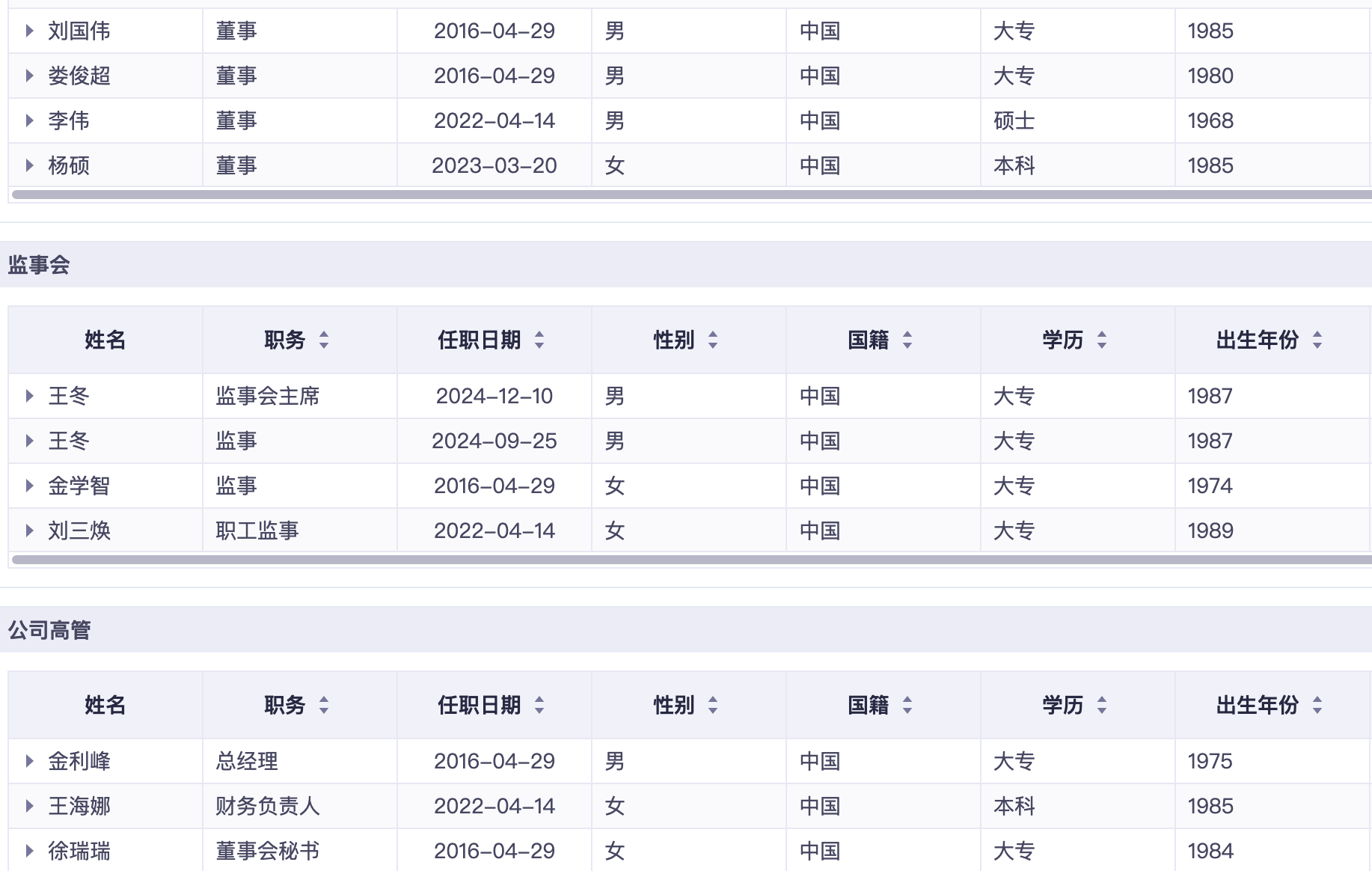据同花顺最新的企业高管介绍,娄俊超、刘国伟、徐瑞瑞、金学智均为专科学历。