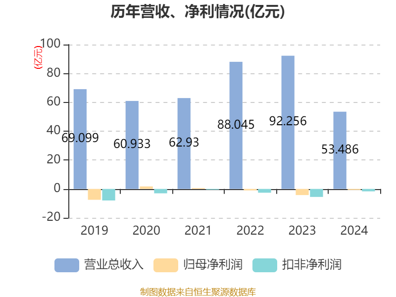 中证智能财讯航天机电(600151)3月8日披露2024年年度报告。2024年,公司实现营业总收入53.49亿元,同比下降42.02%;归母净利润亏损7116.49万元,上年同期亏损4.26亿元;扣非净利润亏损1.68亿元,上年同期亏损5.54亿元;经营活动产生的现金流量净额为-2.13亿元,上年同期为4.7亿元;报告期内,航天机电基本每股收益为-0.0496元,加权平均净资产收益率为-1.45%。