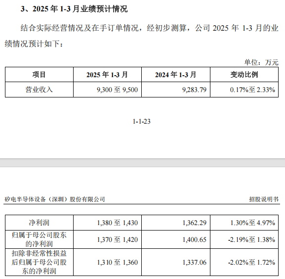 矽电股份管理层预计,公司2025年第一季度的营业收入为9300万元至9500万元,同比变动比例为0.17%至2.33%;归母净利润为1370万元至1420万元,同比变动比例为-2.19%至1.38%。