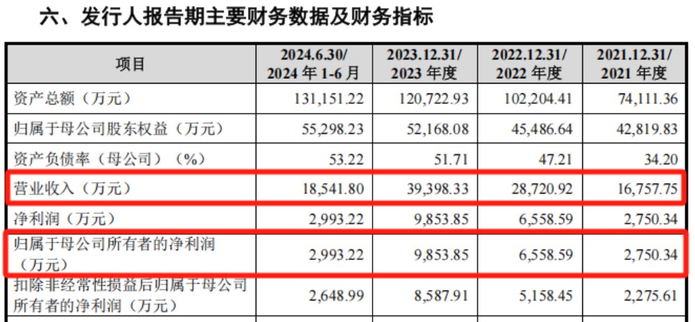 2021年至2024年,胜科纳米的营业收入分别为1.68亿元、2.87亿元、3.94亿元、4.15亿元,归母净利润分别为2750.34万元、6558.59万元、9853.85万元、8159.60万元。