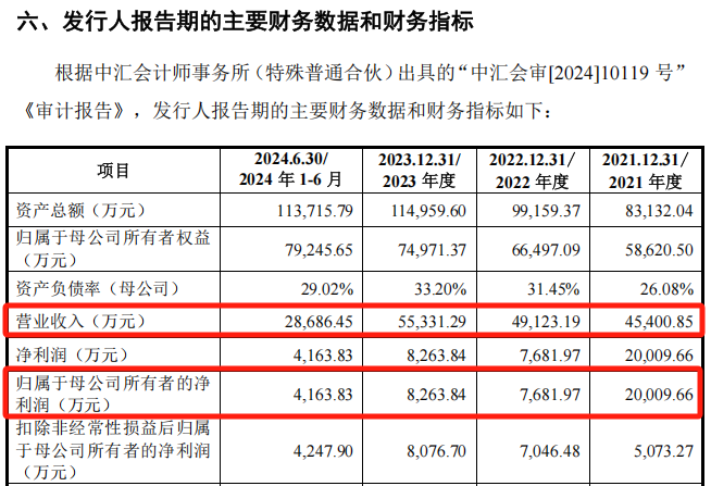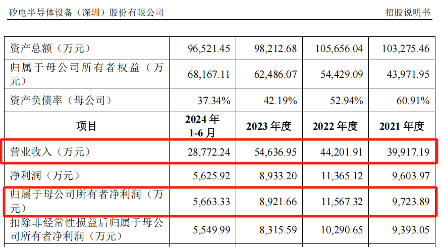 2021年至2024年,矽电股份的营业收入分别为3.99亿元、4.42亿元、5.46亿元、5.08亿元;归母净利润分别为9723.89万元、1.16亿元、8921.66万元、9279.57万元。