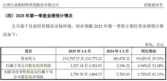 江南新材管理层预计,公司2025年第一季度的营业收入为21.48亿元至23.38亿元,同比增长19.02%至29.53%;归母净利润为3327.18万元至4393.05万元,同比增长0.94%至33.28%。
