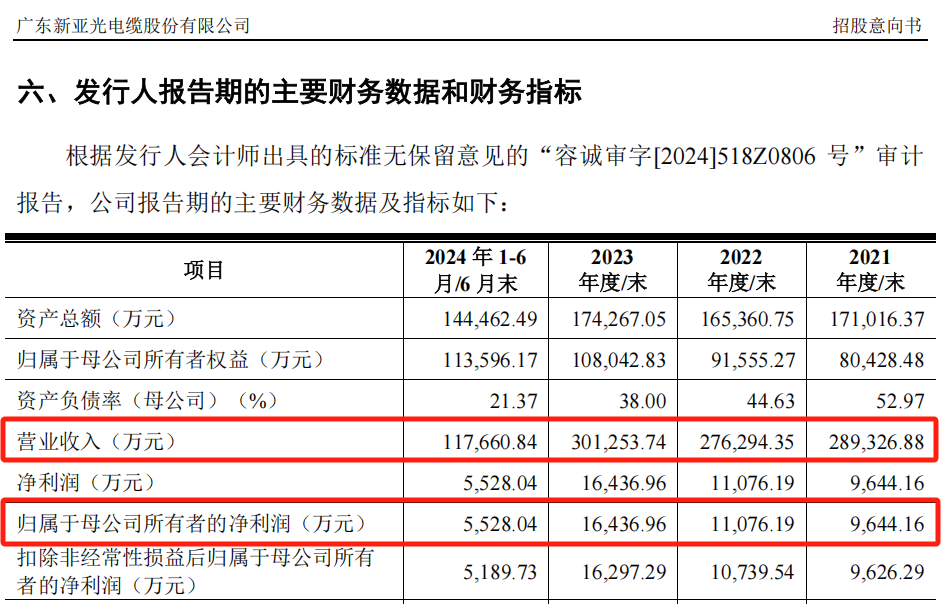 2021年至2024年,新亚电缆的营业收入分别为28.93亿元、27.63亿元、30.13亿元、28.34亿元;归母净利润分别为9644.16万元、1.11亿元、1.64亿元、1.35亿元。