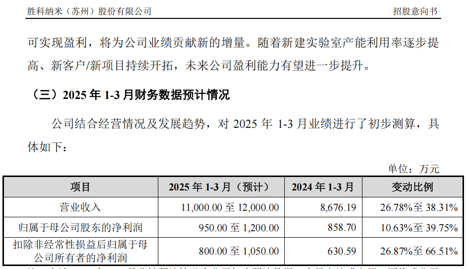 胜科纳米预计,公司2025年第一季度的营业收入为1.10亿元至1.20亿元,同比增长26.78%至38.31%;归母净利润为950万元至1200万元,同比增长10.63%至39.75%。