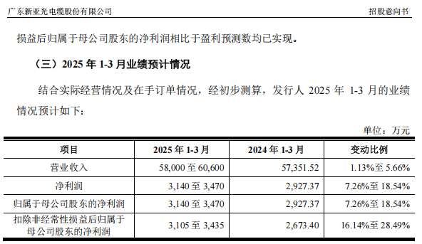新亚电缆管理层预计,公司2025年第一季度的营业收入为5.80亿元至6.06亿元,同比增长1.13%至 5.66%;归母净利润为3140万元至3470万元,同比增长7.26%至18.54%。