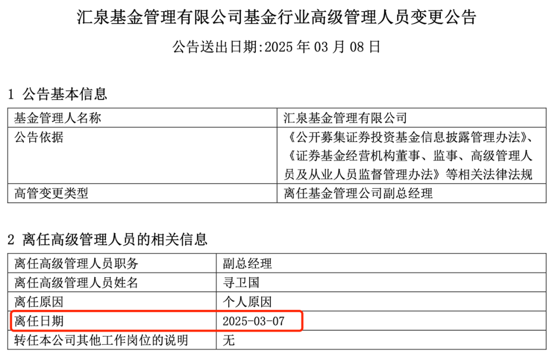 汇泉基金最新发布的《基金行业高级管理人员变更公告》显示,公司副总经理寻卫国因个人原因离任,离任日期是2025年3月7日,且暂无转任公司其他工作岗位的说明。