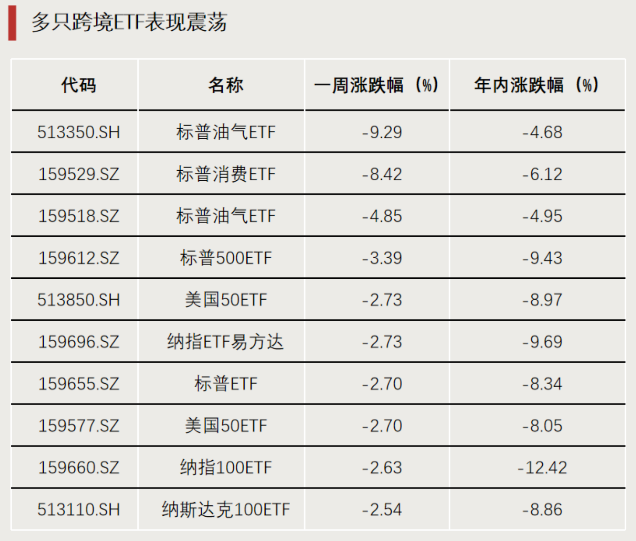 上周,多只跨境ETF表现震荡,标普油气ETF(513350)一周跌幅超过9%。此外,多只纳斯达克主题的ETF产品表现震荡。拉长时间来看,部分纳斯达克主题的ETF年内跌幅已经超过10%。