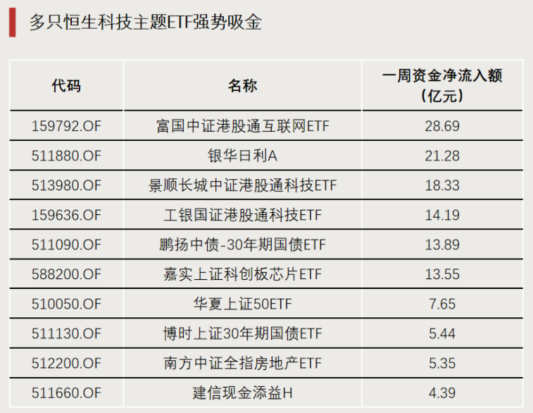 具体来看,资金净流入方面,上周多只恒生科技主题ETF吸金显著。一周净流入额前十的ETF中,有3只为港股科技主题ETF,合计“吸金”近61.21亿元。此外,华夏上证50ETF、嘉实上证科创板芯片ETF等产品亦获较多资金净流入。