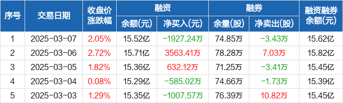 融资方面,当日融资买入9053.86万元,融资偿还1.1亿元,融资净偿还1927.24万元。融券方面,融券卖出3.38万股,融券偿还6.81万股,融券余量74.85万股,融券余额1008.23万元。融资融券余额合计15.62亿元。