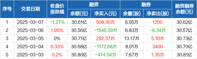 融资方面,当日融资买入5271.71万元,融资偿还4763.41万元,融资净买入508.3万元。融券方面,融券卖出1.57万股,融券偿还1.45万股,融券余量6.95万股,融券余额107.86万元。融资融券余额合计30.62亿元。