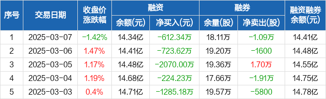 融资方面,当日融资买入8967.64万元,融资偿还9579.98万元,融资净偿还612.34万元,连续5日净偿还累计4915.37万元。融券方面,融券卖出0股,融券偿还1.09万股,融券余量18.11万股,融券余额702.67万元。融资融券余额合计14.41亿元。