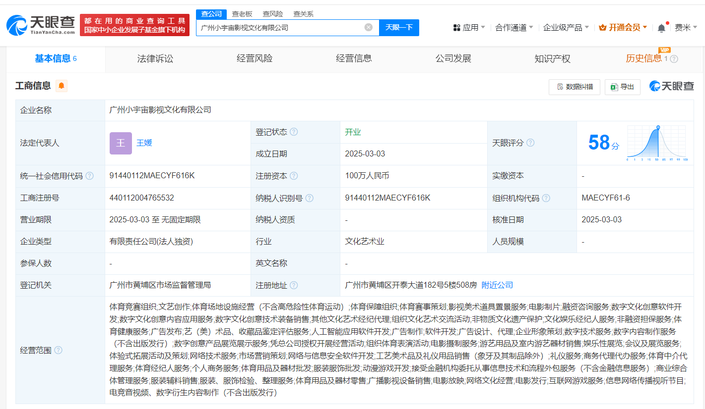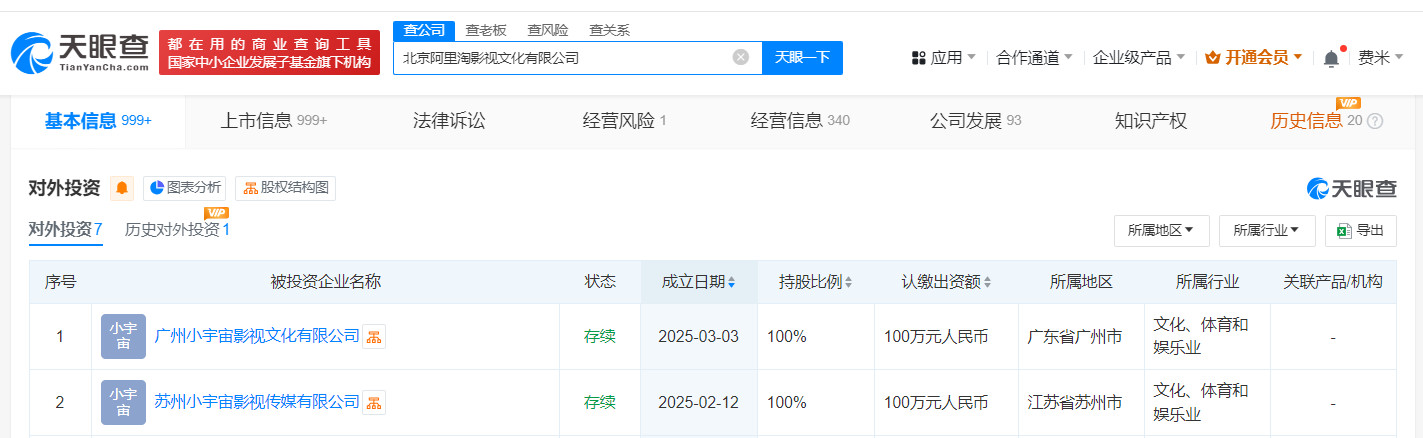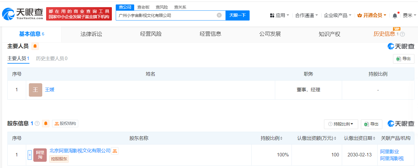 每经AI快讯,天眼查App显示,近日,广州小宇宙影视文化有限公司成立,法定代表人为王媛,注册资本100万元人民币,经营范围含体育竞赛组织、文艺创作、体育保障组织、体育赛事策划、影视美术道具置景服务、电影制片等,由阿里影业旗下北京阿里淘影视文化有限公司全资持股。值得一提的是,此前,北京阿里淘影视文化有限公司成立了苏州小宇宙影视传媒有限公司。