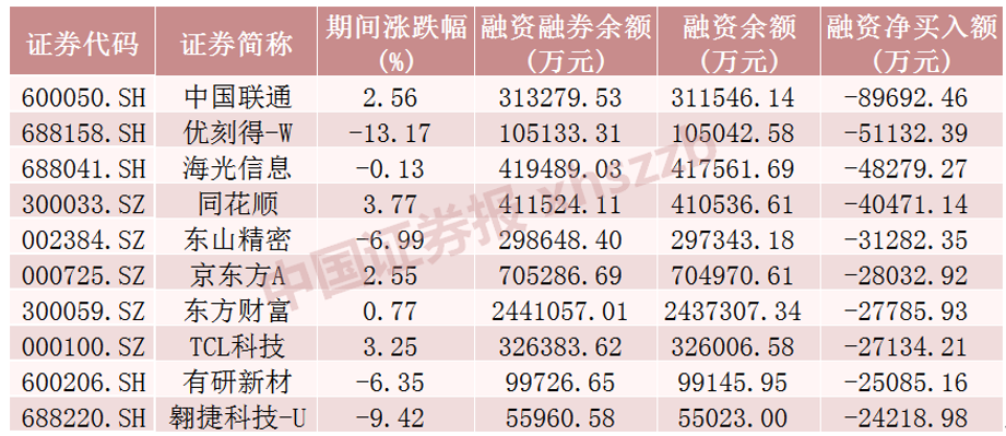 上周融资客对49只股票减仓超1亿元,减仓居前的10只股票分别为中国联通、优刻得-W、海光信息、同花顺、东山精密、京东方A、东方财富、TCL科技、有研新材、翱捷科技-U,分别净卖出8.97亿元、5.11亿元、4.83亿元、4.05亿元、3.13亿元、2.8亿元、2.78亿元、2.71亿元、2.51亿元、2.42亿元。这十只股票上周涨跌参半,跌幅最大的优刻得-W跌逾13%,涨幅最大的同花顺涨逾3%。