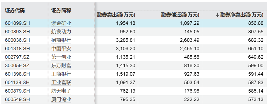 上周融券净卖出额居前的股票为紫金矿业、航发动力、招商银行,分别为856.88万元、807.55万元、682.32万元。