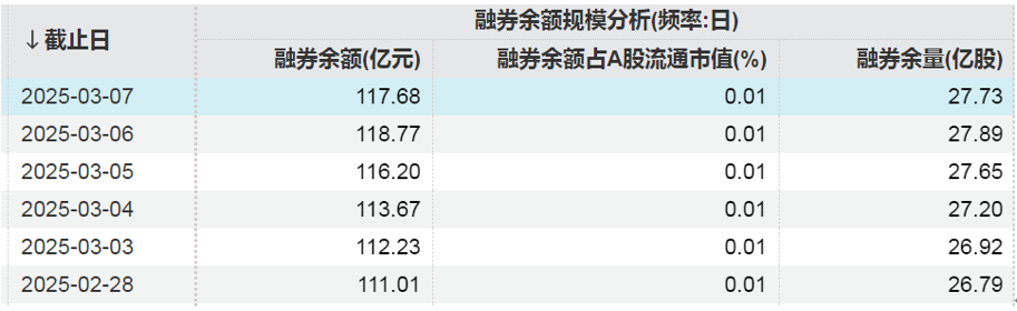 截至3月7日,A股市场融券余额为117.68亿元,上周融券余额增加6.67亿元,融券余量为27.73亿股。