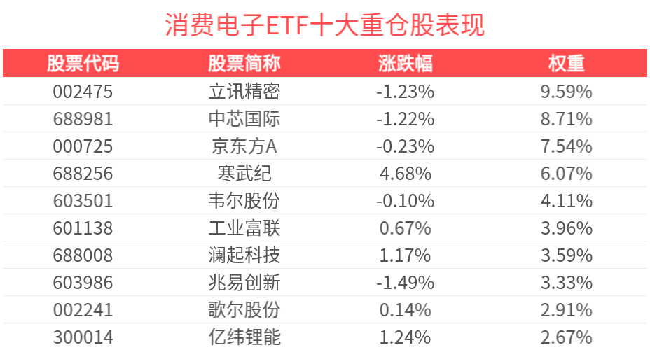 数据显示,截至2025年2月28日,中证消费电子主题指数(931494)前十大权重股分别为立讯精密(002475)、中芯国际(688981)、京东方A(000725)、寒武纪(688256)、韦尔股份(603501)、澜起科技(688008)、兆易创新(603986)、工业富联(601138)、歌尔股份(002241)、亿纬锂能(300014),前十大权重股合计占比53.86%。