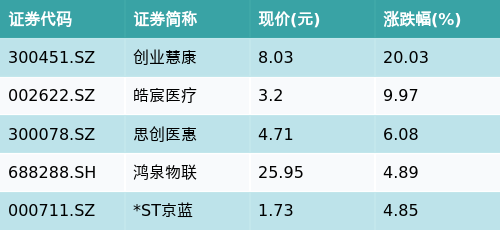 截至收盘,大数据主题涨跌幅最高的五只股票为:创业慧康(300451.SZ)、皓宸医疗(002622.SZ)、思创医惠(300078.SZ)、鸿泉物联(688288.SH)与*ST京蓝(000711.SZ)。详情见下表: