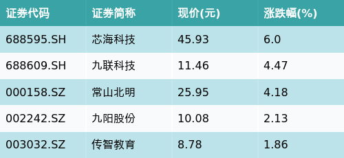 截至收盘,华为鸿蒙主题涨跌幅最高的五只股票为:芯海科技(688595.SH)、九联科技(688609.SH)、常山北明(000158.SZ)、九阳股份(002242.SZ)与传智教育(003032.SZ)。详情见下表: