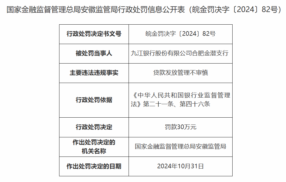 而在安徽,九江银行也在2024年受到了一次行政处罚。2024年11月18日,国家金融监督管理总局安徽监管局发布了两则行政处罚信息公开表,针对九江银行合肥金潜支行及时任支行行长焦黎君的违法违规行为进行了行政处罚:因贷款发放管理不审慎,该支行被处以30万元罚款;焦黎君因对支行贷款发放管理不审慎负有责任被给予警告。