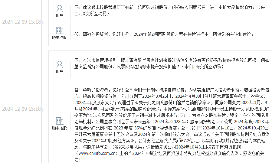 另外,每经资本眼研究员发现,顺丰控股在2024年一次性将过去几年间的数次回购股份共计约7929万股,由股权激励或员工持股计划用途调整为注销减资,且目前已经注销完成。此举有利于增厚每股收益,切实提高公司股东的投资回报,增强投资者信心。日前,在投资者互动平台,有投资者呼吁公司开始新一轮的股份回购注销。那么,正在实施中的回购方案,后续有没有可能再次调整回购用途变为注销减资,响应投资者的诉求呢?顺丰控股相关工作人员表示,很多投资者应该都希望公司把回购的股份注销,因为可以增厚投资者的回报。但后续的安排,还需要看公司,这边暂时也没有相关信息。如果有变更,会以正式公告的形式告知投资者。