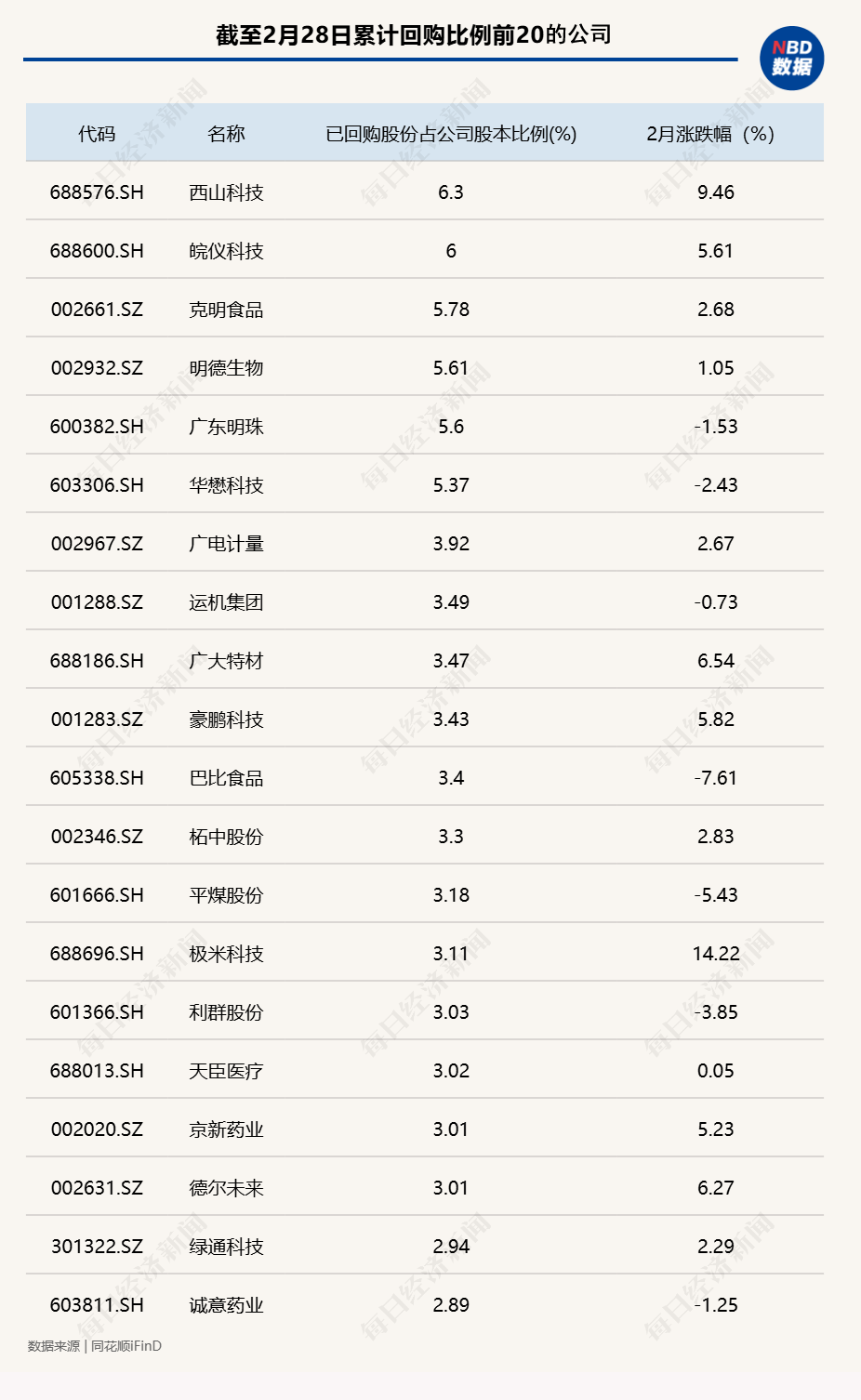 据同花顺数据统计,截至2月28日,正在回购的公司中,累计回购比例居前的公司有西山科技、皖仪科技、克明食品、明德生物、广东明珠和华懋科技等个股。这些个股已回购的股份占总股本比例均在5%以上,分别为6.30%、6.00%、5.78%、5.61%、5.60%、5.37%。