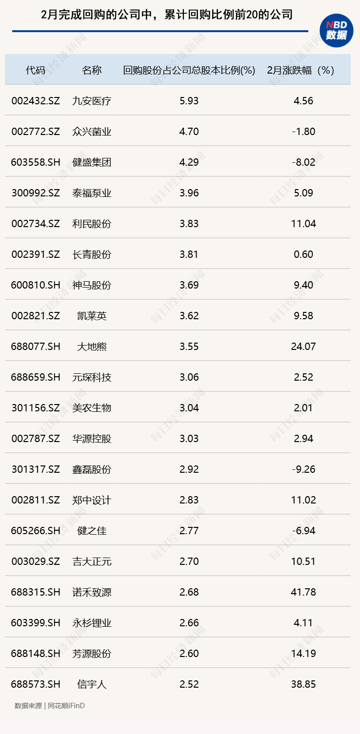 2月完成回购的公司中,累计回购比例居前的公司除九安医疗外,还有众兴菌业、健盛集团、泰福泵业、利民股份和长青股份等个股,回购数量占公司总股本比例分别为:4.70%、4.29%、3.96%、3.83%和3.81%。