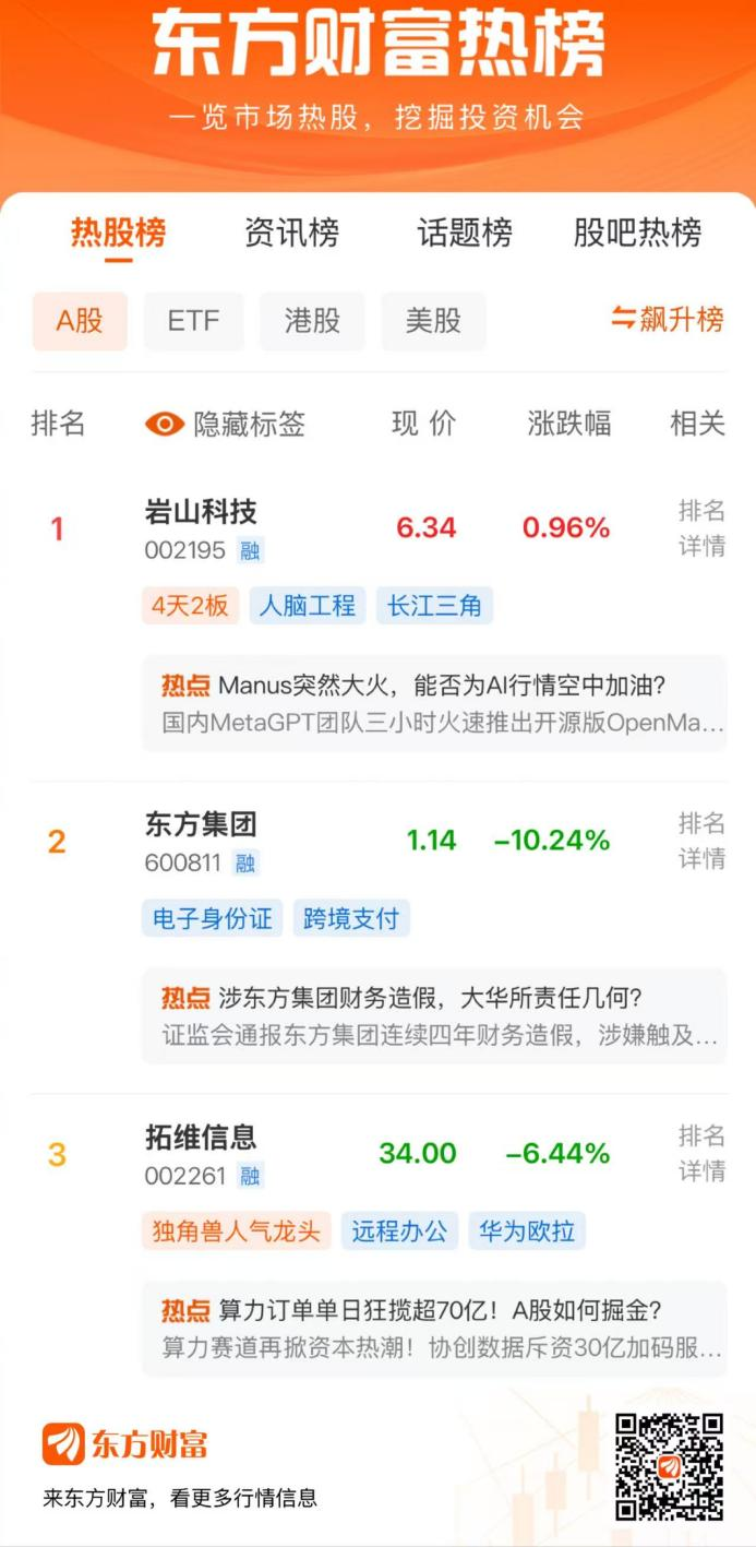 3月10日,两市震荡调整,三大指数均小幅收跌。东方财富热股人气榜前三的股票中,岩山科技位列第1,东方集团位列第2,拓维信息位列第3。