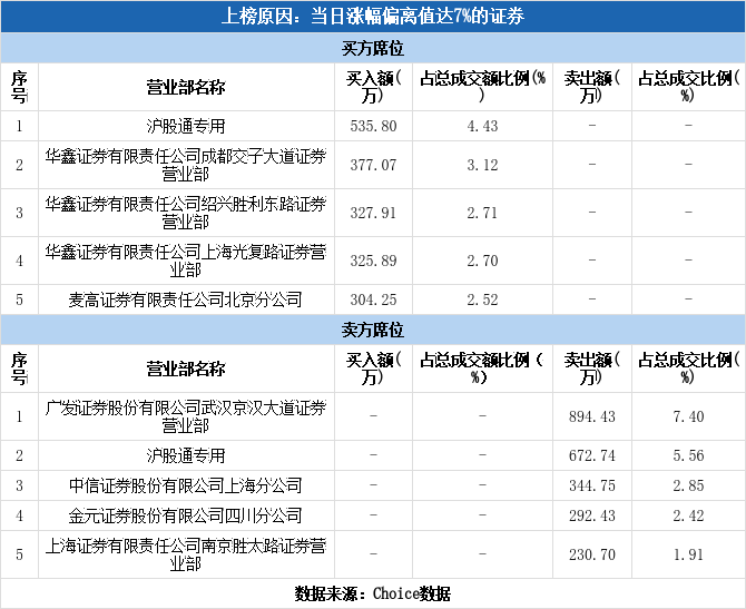 今日龙虎榜单上出现了沪股通的身影,占据了买一、卖二的位置,净卖出136.94万,占当日成交总额的1.13%。